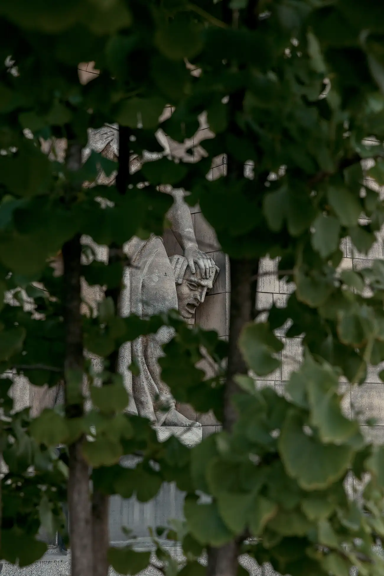 Pałac Kultury nie byłby klasyczną budowlą socrealizmu, gdyby nie zdobiące go rzeźby atletycznych postaci. Znajdują się one z dwóch stron gmachu – od placu Defilad i ulicy Emilii Plater. Stoją w niszach bocznych skrzydeł oraz siedzą na cokołach przed kolumnowymi portykami. Dwa największe posągi znajdują się przy głównym wejściu do Pałacu. Po lewej siedzi wykuta z szarego granitu czterometrowa postać Adama Mickiewicza, symbolizująca świat kultury. Po prawej widzimy, wykonaną z tego samego materiału, jeszcze wyższą sylwetkę Mikołaja Kopernika uosabiającą świat nauki.